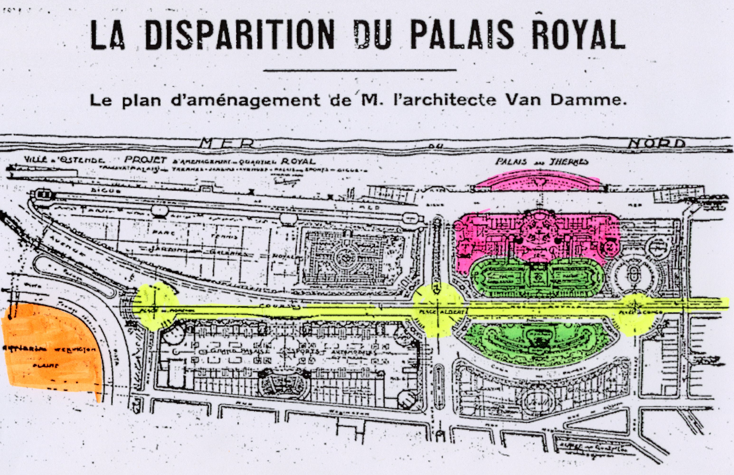 De Oostendse architect Gustaaf Vandamme (1870-1938)[4] werkte een gedetailleerd plan uit voor de inplanting van het Thermenpaleis op de site van het Koninklijk Chalet dat volledig zou worden gesloopt. Het vrijgekomen terrein zou op niveau van de omliggende straten komen en met het overtollige zand zou de vijver van het Citypark worden opgevuld. De voorgevel van het toekomstig Thermenpaleis met aangehecht hotel zou uitgeven op de Zeepromenade en de achtergevel op de Koningin Astridlaan. Aan de kant van de Zeepromenade zouden op de gelijkvloerse verdieping winkels komen en op de bovenverdiepingen hotelkamers en feestzalen. Aan de kant van de Koningin Astridlaan voorzag de ontwerper twee zwembaden, één voor vrouwen en één voor mannen, en op de binnenkoer een Trinkhall. De Venetiaanse gaanderijen aan de Parijsstraat zou hij bewaren.